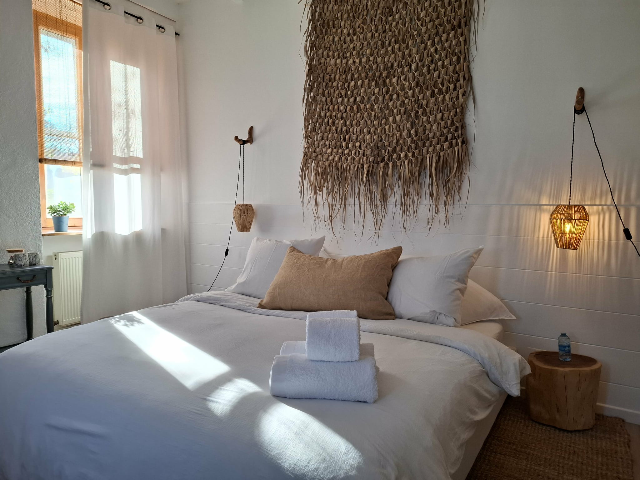 La chambre est décorée dans un style bohème chic et épuré avec des matières chaudes et naturelles tel que le bois, le coton, le raphia, les feuilles de palmier tressées, les draps sont en coton 100%.