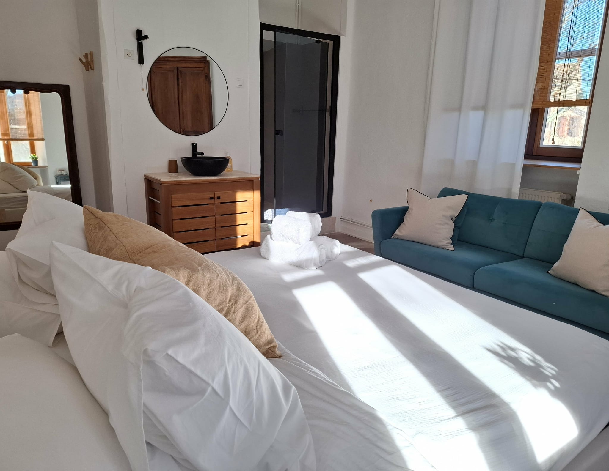 - Attenante une salle d’eau avec une douche à l’italienne, wc, serviettes blanches 100% coton, gel douche bio et savon de Marseille, sèche-cheveux